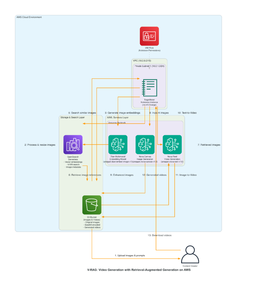 To address this, we developed a Video Retrieval Augmented Generation (VRAG) multimodal pipeline that transforms structured text into bespoke videos using a library of images as reference. Using Amazon Bedrock, Amazon Nova Reel, the Amazon OpenSearch Service vector engine, and Amazon Simple Storage Service (Amazon S3), the solution seamlessly integrates image retrieval, prompt-based video generation, and batch processing into a single automated workflow. Users provide an object of interest, and the solution retrieves the most relevant image from an indexed dataset. They then define an action prompt (for example, “Camera rotates clockwise”), which is combined with the retrieved image to generate the video. Structured prompts from text files allow multiple videos to be generated in one execution, creating a scalable, reusable foundation for AI-assisted media generation.