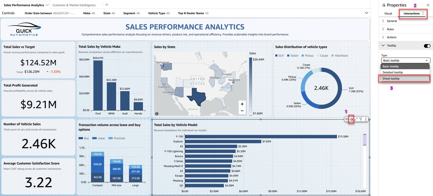 The following video shows an example of the Automotive Sales Performance dashboard sheet tooltip displaying Sales vs. Target, Monthly Sales trend and image of selected model when hovering over a model data point. Your tooltip content will vary based on the visuals and metrics you choose for your specific use case.