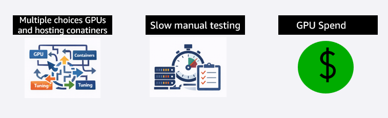 The decision space is impossibly large. A single deployment involves choosing from over a dozen GPU instance types, multiple serving containers, various parallelism degrees, and a growing set of optimization techniques such as speculative decoding. These all interact with each other, and there is no validated guidance to narrow the search. The only way to find the right configuration is to test, and that is where the real cost begins. Teams provision instances, deploy the model, run load tests, analyze results, and repeat. This cycle takes two to three weeks per model and requires expertise in GPU infrastructure, serving frameworks, and performance optimization that most teams do not have in-house.